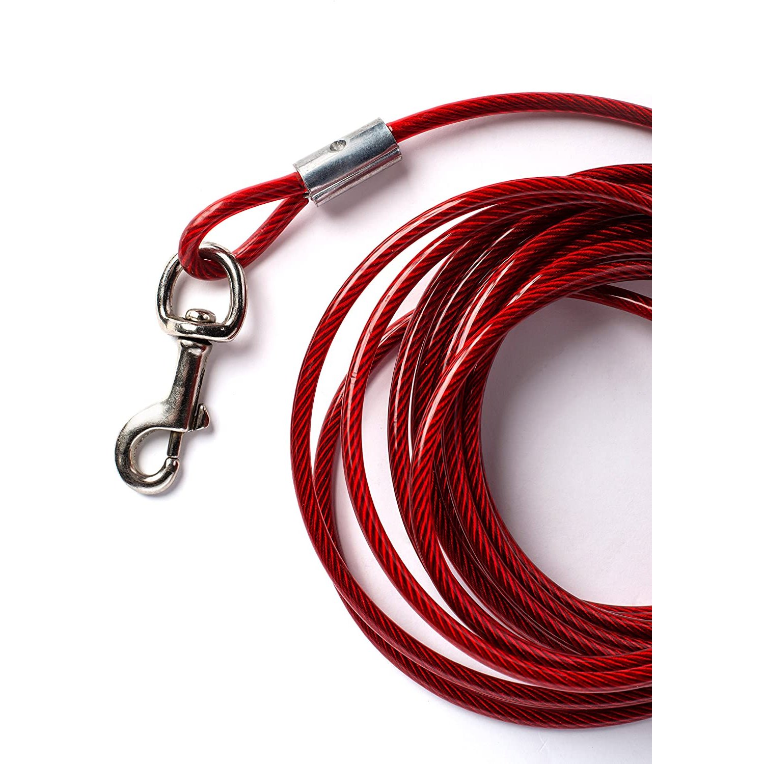 Prevue Pet Products heavy-duty 20Æ TIE-OUT cable 2122 is designed for dogs up to 130 lbs. Heavy duty, galvanized aircraft-grade wound-steel cable is housed within crack-resistant, high visibility red vinyl casing to ensure your dog stays safe and secure. Premium quality die-cast iron swivel bolt snaps at both ends to connect easily. Heavy duty tie out cable is 20 foot long with a 4.0 mm diameter wire cable; 6.3 mm in vinyl casing.
